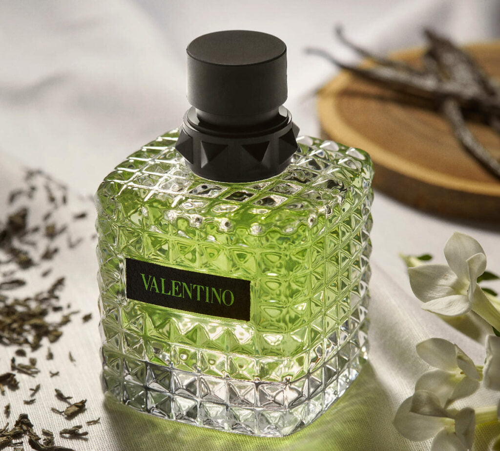 El frasco, inspirado en los icónicos Rockstud de Valentino, combina un vibrante verde con cuero negro, reflejando estilo, modernidad y audacia.